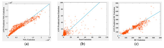 In order to compare the predictive capability of these two methods, another group of data, covering different and wider range of operating conditions, were used for the test and validation (Figure 4; red squares). As shown in Figure 8, the red marks represent the results of the ANN method, while the cyan marks are the results predicted by the quadratic function. In general, both methods show reasonable prediction results for emissions and performance at most conditions. However, combustion products and emissions with highly non-linear characteristics are still difficult to estimate, for example, soot. Besides this, ANN tends to show larger random errors for high value results, while quadratic function tends to underestimate the high value. Comparing the prediction results of NOx and other incomplete combustion products by quadratic function and ANN, the prediction accuracy of quadratic function is similar to that of ANN.