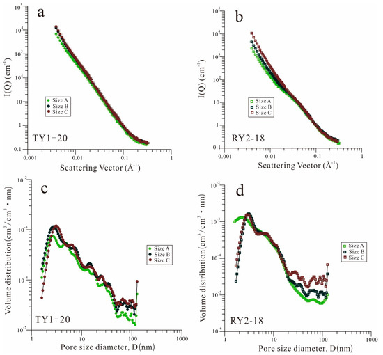 The relationship between the scattering vector (Q) and pore radius (R) can be transformed by the empirical equation R = 2.5/Q [30]. The PSD of the samples with different particle sizes are illustrated in Figure 3c,d for comparison. For the TY1-20 sample (Figure 3c), the pore volumes of both size B and size C were significantly higher than those of size A within the pore size range tested by SANS. For the RY2-18 sample (Figure 3d), as the particle size decreased, the pore volume of the pores with a diameter greater than 20 nm increased considerably. In addition, the pore volumes of size B and size C within the pore size range of 2~5 nm were also significantly higher than that of size A.