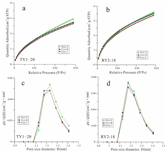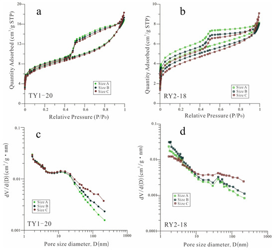 Figure 4a,b show the N2 adsorption–desorption isotherms of the two shale samples for the three different particle sizes. All samples display distinct hysteresis loops, and the hysteresis influence of desorption is mostly due to the pore morphology (ink-bottle shape). A comparison of the adsorption branches shows that the shale samples with the minimum particle size exhibit the maximum adsorption capacity at the maximum equivalent pressure. The observation of the desorption branches demonstrates that the desorption rate increases as the particle size decreases from size A to size C. In other words, the decrease in sample particle size shortens the distance required for desorption, thus enhancing the pore connectivity and gas transport capacity.