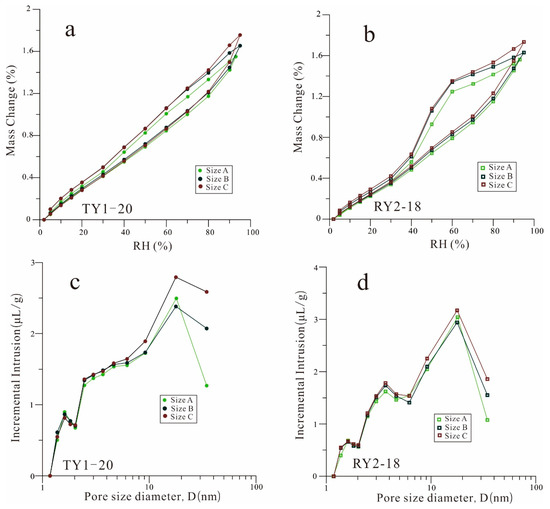 The water vapor adsorption–desorption isotherms of the shale samples are presented in Figure 6a,b. As the particle size decreased, the total water adsorption of the shale samples under 95% RH increased continuously (Table 3). When the RH is higher than 70%, the WVA curves of samples with different particle sizes are the most distinct. According to Equations (1)–(3), the results of the distribution relationship between pore size diameter and water incremental intrusion are shown in Figure 6c,d. Within the pore size range, less than 6.2 nm (corresponding to approximately 70% RH), the water absorption capacity of the samples with different particle sizes did not differ significantly. However, with pore sizes larger than 6.2 nm, the water vapor uptake increased dramatically with decreasing particle size. In general, the adsorption of water vapor in shale occurs in three stages: monomolecular-layer coverage, multimolecular-layer adsorption, and capillary condensation with an increase in humidity [18,35]. Therefore, the influence of particle size on the WVA of the overmature shale is primarily reflected in the stage of capillary condensation.