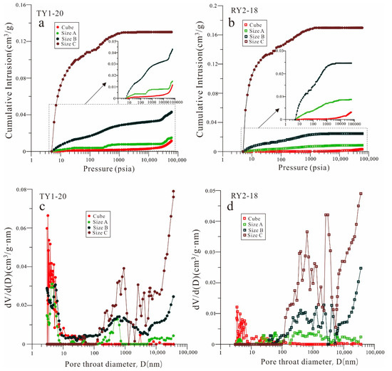 The cumulative mercury intrusion curves and pore-throat size distribution curves for all sample sizes of TY1-20 and RY2-18 are illustrated in Figure 7. As shown in Figure 7, as the sample size decreased, the cumulative mercury intrusion volume increased. The cumulative intrusions of sample TY1-20 from the cube to size B increased even at the maximum pressure (413 MPa), indicating that mercury will continue to enter the pore space if the pressure is increased. However, for TY1-20 with size C, the cumulative intrusion would not increase when the pressure was higher than 4000 psia. For sample RY2-18, the cumulative intrusion volume of all the samples except the cube will be constant after a certain pressure.