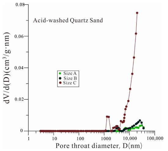 The pore-throat size distribution curves (Figure 7) indicate that the accessible pore volume connected with the pore throat less than 10 nm in the cube samples will be greatly reduced in the particle samples. For the samples with particle size C, the pore network space connected with a pore throat of less than 100 nm almost disappeared. Contrarily, the connected pore volume of the samples with pore-throat diameters larger than 100 nm dramatically increased with the decrease in sample size. Furthermore, the MICP results of acid-washed quartz sand with different particle sizes demonstrated that the influence between particles was mostly manifested on the micron scale (Figure 8).