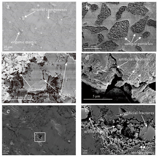 Among the artificial microcracks, artificial microfractures perpendicular to the bedding direction are more conducive to enhancing pore connectivity. As illustrated in Figure 9d, the hydrocarbon fluids in the original pores could flow out through artificial microfractures, whereas the small molecular fluid in fluid-invasion porosimetry can enter the original pores through the artificial microfractures. The marks of the crushing process on the smooth surface by argon-ion-beam polishing could be observed in the local area of the particle sample (Figure 9e). By magnifying the observation of the crush area (Figure 9f), it was found that the artificial pore-fracture is manifested in three forms: (1) the separation of rigid minerals (quartz, calcite, etc.) and plastic components (organic matter and clay) to form artificial pore-fractures; (2) the fragmentation of mineral grains to form artificial fractures; and (3) the spalling of mineral grains, such as pyrite, to form artificial moldic pores.