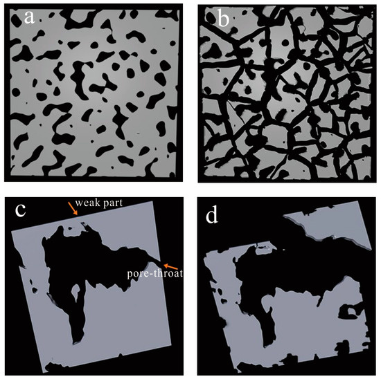 Model of an intact shale and a particle shale (a,c) before and (b,d) after crushing (the gray areas denote the shale solid matrix, and the black areas denote pores or fractures space).