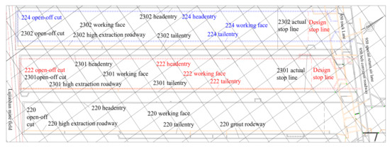 In Xiashijie Coal Mine, the widths of the 2301 and 2302 working faces of the 3-2 seam are 210 m and 240 m, respectively, and the widths of the 222 and 224 working faces of the 4-2 coal seam are 170 m and 200 m, respectively. The mining sequence of the coal seam group is a 2301 working face, 2302 working face, and 224 working face. The parameters of the working face are shown in Table 1, and the plane layout of the working face is shown in Figure 2.