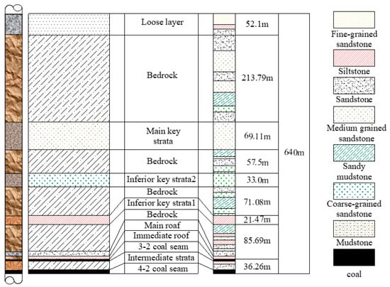 The 4-2 coal seam of Xiashijie Coal Mine has an average buried depth of 640 m. There is one key layer and two sub-key layers in the upper rock layer of the coal seam. Figure 3 shows a schematic diagram of the coal mine strata structure based on the geological data of the coal mine and the results of drilling holes.