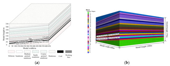 According to the stratum structure and engineering background, a three-dimensional numerical analysis model was constructed by using 3DEC discrete element numerical simulation software. The external dimension of the model (length × width × height) was 1200 × 640 × 350 m. The design and construction of the model are shown in Figure 4a,b, respectively. After constructing the model with 3DEC numerical simulation software, gravity was applied to the upper surface of the model. Displacement boundaries were applied to the front, back, left, right and bottom of the model. The upper surface of the model was a free surface so that the overlying strata and the ground surface could be continuously deformed during the mining process on the working face. According to the actual pushing progress of the mine, the daily pushing progress of the 2301 face and 2302 face in 3-2 coal seam was 6 m. Through the calculation and analysis of numerical simulation, the overburden stress distribution and fracture evolution characteristics were studied, and the temporal and spatial evolution distribution characteristics of overburden fractures were revealed.