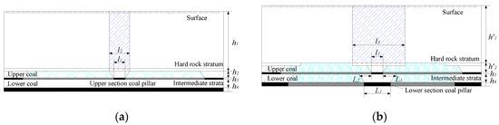 The mechanical model of overburden structure in close-distance coal seam group mining is shown in Figure 5, in which the dynamic models of single-layer coal mining and repeated mining are shown in Figure 5a,b, respectively. l1 and l2 are the width of the coal pillar in the upper section and the length of the upper inverted ladder body (m); h1, h2, h3 and h4 are the height of hard rock and its upper stable overburden, the height of inverted trapezoid in the upper section of coal pillar, the thickness of upper coal seam, and the thickness of middle strata, respectively (m). l3 is the width of the upper stable overburden after repeated mining (m), and h’1 and h’2 are the height of the upper stable overburden after repeated mining and the height of the upper inverted ladder of the upper section of coal pillar, respectively. L1, L2 and L3 are the width of the coal pillar in the lower section, and the left and right residual width of the lower inverted ladder except for the coal pillar in the upper section, respectively (m).