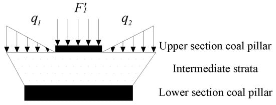 The double-section coal pillar was extracted from the dynamic structure model of repeated mining of close-distance coal seam group, and the force analysis of the double-section coal pillar is shown in Figure 6. According to this model, the force acting on the upper strata of the coal pillar in the lower section was analyzed, and the size of the coal pillar in the lower section was reasonably optimized.