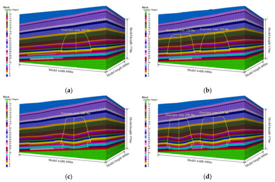 According to the three-dimensional model, the distribution law of the height of the two zones under repeated mining in the close-distance coal seam working face is shown in Table 5, and it can be ascertained from the comprehensive development height of the two zones: