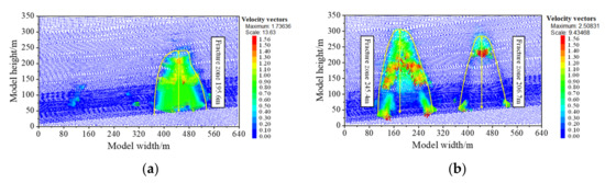 Figure 9 shows the distribution characteristics of the post-mining tendency stress field of the close adjacent face. The distribution of the post-mining stress field of face 2301 is shown in Figure 9a. The stress of the overburden in the goaf of face 2301 decreased considerably, and the vertical stress of the rest of the overlying strata outside the goaf was not significantly different from when the initial balance was stable. The coal wall showed obvious stress concentration effects, and the vertical stress of coal seam 3-2 was generally up to 40 MPa. The maximum vertical stress of local overburden reached 70 MPa. The post-mining stress field distribution of the 2302 face is shown in Figure 9b, and the stabilized 3-2 coal seam floor stress is mainly in the range of 12.5–22.6 MPa, with an average stress of 17.2 MPa. The floor stress at the initial equilibrium shows a slightly higher stress in the deep part of the left side of the coal seam.