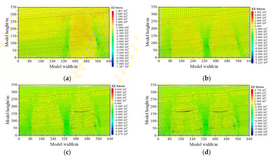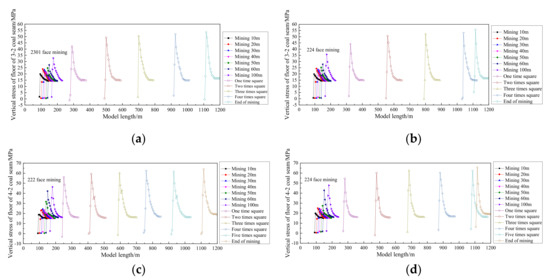 Stress variation strike of repeated mining floor in close-distance coal seam. (a) is 2301 working face after mining, (b) is 2302 working face after mining, (c) is 222 working face after mining, (d) is 224 working face after mining.