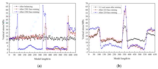 Due to the wide range of the overburden in the stress field distribution characteristics of Figure 9, the color bars of the coal floor stress are less different. Therefore, the stress curve of the coal floor after mining on the working face is shown in Figure 10. Figure 10a shows the stress change of floor in 3-2 coal seam mining. After the initial equilibrium, the floor stress of the 3-2 coal seam was within the range of 12.50~22.60 MPa, with an average stress of 15.72 MPa, and the floor stress at the initial balance showed the characteristics of slightly higher stress in the deep area on the left side of the coal seam. After the end of mining on the 2301 working face, the stress distribution curve in the range of 350.0–580.0 m was U-shaped, and there was obvious stress concentration on the coal floor on both sides of the goaf. The peak stress of the floor on the left side of the goaf was 40.65 MPa, 2.59 times higher than that of the initial balance, which was less than that on the right side of the goaf, where the stress was 52.33 MPa.