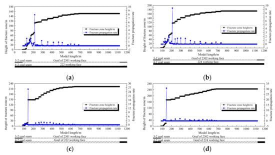 The evolution trends of fractures in the mining process of working faces 222 and 224 in the 4-2 coal seam are shown in Figure 12c,d, respectively. The initial fracture height of the working face 222 was 4.2 m. During the process of mining 0~60 m, the fracture expansion rate fluctuated in the range of 0~0.84, and the fracture development gradually increased with the advancing of the working face. When the working face was mined for 60 m, the fracture height was 18 m. When 222 working face was mined to 65 m, the middle strata of the 3-2 coal seam and 4-2 coal seam collapsed intensively, which made the fractured zone develop rapidly to the upper part of the 2301 goaf after repeated mining, the fracture expansion rate reached the maximum value of 25.98 in the process of mining the working face, and the fracture zone height suddenly increased to 148.8 m. During the gradual advancing process from 65 m to 540 m in the 222 working face, the fracture propagation rate was less than 1.86, and there were 13 relatively obvious fracture development processes which generally decreased step by step. During the advancing process of the 222 working face after mining 540 m, the upward expansion rate of fracture was 0, and the maximum height of fracture zone was 223.1 m.