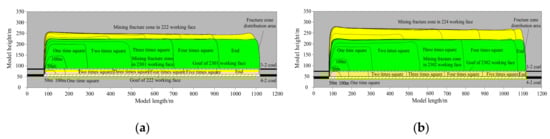 Figure 8 shows the spatial distribution characteristics of the repeated mining tendency fracture field of the 4-2 coal seam at the model length of 600 m, in which the distribution of the post-mining crack field is shown in Figure 8a. The roof crack field extended upward, and the concentrated distribution area of crack field showed “ladder” distribution. The strata deformation area was mainly concentrated in the range of model length 380–540 m and height 30–220 m, and the maximum height of the fractured zone was about 195.6 m. The distribution characteristics of the fractured field in the overlying strata at the end of mining in the 224 working face are shown in Figure 8b. The crack field in the roof of the 224 face expanded upward, and the concentrated distribution area of the crack field was “ladder”. The deformation area of the strata was mainly concentrated in the range of the model length 110–280 m and the height of 20–270 m, and the maximum height of the fractured zone was about 245.5 m. At this time, the height of the fractured zone in the goaf of the 222 working face continued to develop upward to 206.7 m.