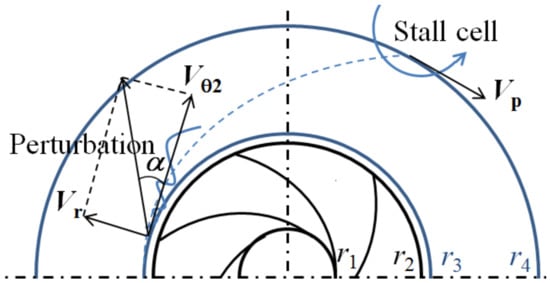 Illustration of the inlet perturbation and stall cell in the vaneless diffuser (Vr: radial velocity; Vθ2: tangential velocity; r1 and r2: impeller inlet and outlet radii; r3 and r4: diffuser inlet and outlet radii).