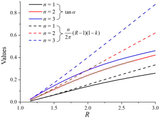 With the given parameters (n, R), the calculated left- and right-hand sides of Equation (5) are compared in Figure 6, and the following conclusions can be drawn:
