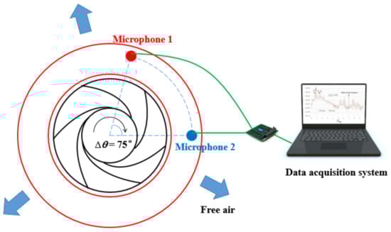 In order to identify the stall modes in a real vaneless diffuser, the experiments were carried out on a centrifugal impeller which was coupled with a vaneless diffuser (R = 1.5), as shown in Figure 7. The main geometrical parameters are listed in Table 3. Since the uniform outlet pressure was assumed in the previous theoretical analysis, the downstream of the vaneless diffuser was connected directly to the atmosphere instead of a volute. The experiment was done in air, the rotating stall was triggered by decreasing the flow rate. Two condenser microphones were installed on the vaneless diffuser at the same radius but with an angular difference of ∆θ = 75°, and then the number of stall cells was obtained based on this angular difference and the measured frequencies of stall modes; more details of the experimental set-up and data manipulation can be seen in Heng et al [41]. All the detected stall modes for each flow condition are listed in Table 4.