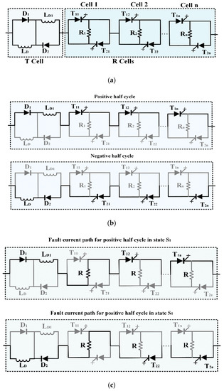 The proposed MCFCL configuration is illustrated in Figure 1a. The MCFCL consists of two main parts, including a transient cell (TC) and n resistive cells (RC) coupled in series arrangement to meet high voltage operation requirements. The TC of the MCFCL include two diodes (D1 and D2) and two transient limiting reactors (TLRs) to limit the transient fault current at the fault occurrence instant. Each RC of the MCFCL consists of two gate-turn off (GTO) semiconductor switches and one limiting resistor.