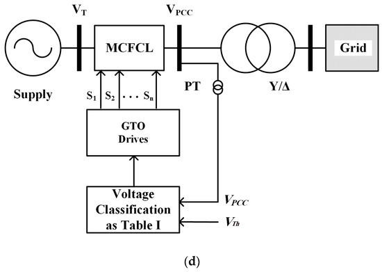 The control system of the MCFCL is illustrated in Figure 1d. Note that the grid coupling voltage succeeding the MCFCL location is used to detect the fault and control the MCFCL operation. First, the voltage at coupling point (VPCC) and the threshold value (VTh) are compared. If VPCC < VTh, the adaptive control circuit detects the fault. Following this, the control system determines the suitable number of cells, which should be inserted in fault path according to Table 1. When the fault is cleared, the VPCC return back to the pre-fault voltage. When the VPCC becomes greater than the VTh, the MCFCL control circuit opens the GTO switches with sequenced arrangements, respectively.