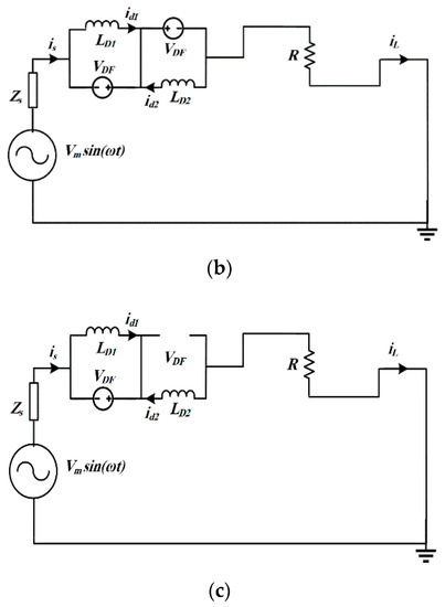 Figure 3b represents the equivalent power circuit of the MCFCL for the period P2. Note that during P2, the current iL is less than its counterpart id1 and the diodes D1 and D2 are in freewheeling state. Considering Figure 3b, the line current is derived as follows: