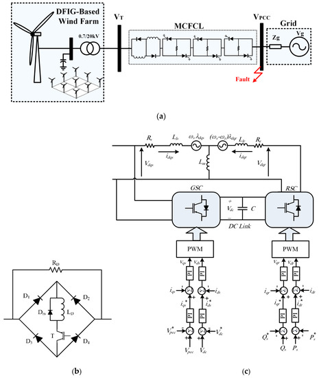 (a) Single diagram of the study system, (b) Power circuit of the SBFCL, (c) Control system of the DFIG converters.