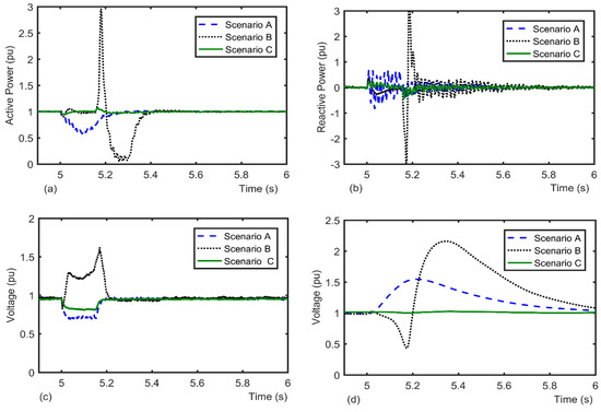 Figure 7a–d present the active power, reactive power and terminal and DC link voltages responses to this severe voltage sag condition. It can be seen from these figures that both MCFCL and SBFCL have similar responses in terms of voltage sag, active power drop, reactive power oscillations, and DC link overvoltage under this condition.