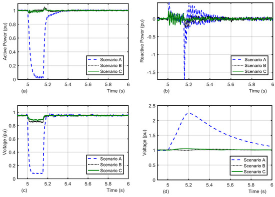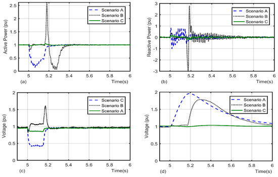 It can be observed from Figure 5a, that the output active power from WF drops to 0.55 pu for scenario A. In scenario B, the active power remains constant during fault occurrence, however; it’s post-fault dynamics show a sharp increase to 3 pu followed by a sudden decrease to near zero, which is harmful for the generator. However, scenario C reveals that using the MCFCL results in lower oscillations in the active power during the fault period and after fault clearance, which provides faster stabilization under faulty conditions. Figure 5b depicts the dynamics of the WF’s reactive power. Note noticeable fluctuations of the WF’s reactive power during post-fault in scenario B. However, with the MCFCL in scenario C, the reactive power fluctuations are lowest, and it quickly returns back to its pre-fault value. Figure 5c shows the dynamics of the terminal voltage for three scenarios under low voltage condition. Considering this figure, the terminal voltage drops to 0.75 pu in scenario A. In scenario B, it raises to 1.5 pu and the DFIG stator experiences transient over-voltage. However, in scenario C, the terminal voltage is 0.9 pu and remains in acceptable range by using the MCFCL.