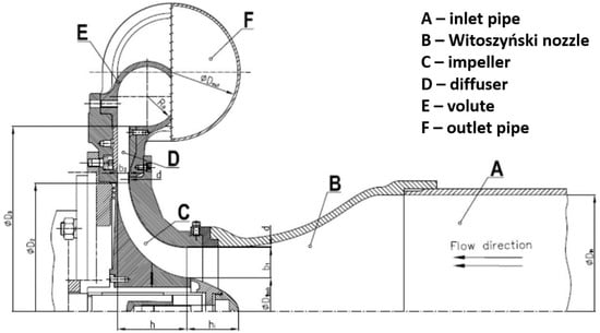 A single-stage centrifugal blower DP1.12 was modelled in this paper. It was designed and constructed by Magiera [24] and then modified for surge investigation. Its further description can be found in [24]. Figure 1 presents its cross-section along with the main dimensions.