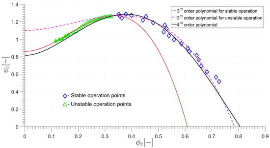The values of W, H and were chosen by the Root Mean Square (RMS) method to provide the closest fit to the experimental results. The fit, however, was significantly far from the measured points at the highest and lowest mass flow rates. Therefore, two different third order polynomials were calculated. The first was generated by the RMS method based on “stable operation points”, while the second was generated by the same method based on “unstable operation points” (see Figure 4). All points correspond to the average value of the mass flow rate and pressure rise obtained throughout the measurement.