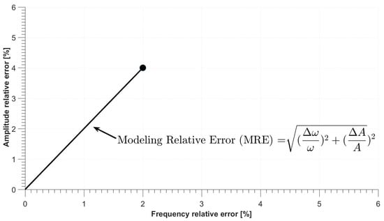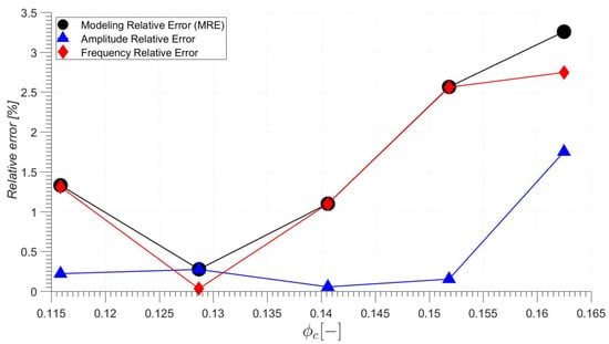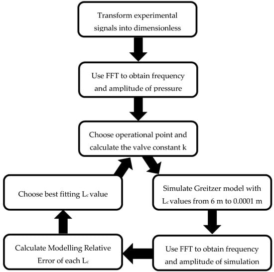 Values of Lc from 6 m to 0.01 m with a step equal to 0.001 m and from Lc from 0.01 to 0.0001 m with a step equal to 0.0001 m were analysed. This spectrum was sufficiently wide to detect a suitable Lc value and to inspect the influence of this parameter on the modelled surge phenomenon. All obtained signals were analysed with the MatLab build-in FFT algorithm. From the signal frequency spectrum, the amplitude and frequency values of the highest peak were automatically registered. To determine the most suitable Lc value The Modelling Relative Error (MRE) was introduced. It was calculated as the square root of the sum of squares of relative errors of the amplitude and the frequency for each simulation. The MRE method of calculation is presented in Figure 6. The simulation with the smallest value of MRE was considered as the best fit to the experimental data. It has to be outlined that the MRE does not represent an error in classic understanding (like measurement error or numerical error). MRE describes the relative difference in two most crucial parameters observed in the experiment and obtained in the model. It is expected that a model with two degrees of freedom and including numerous simplifications [19] should indeed differ in outcome from the experimental observation. Nevertheless, the smaller MRE, the better fit between the model and experimental observation.