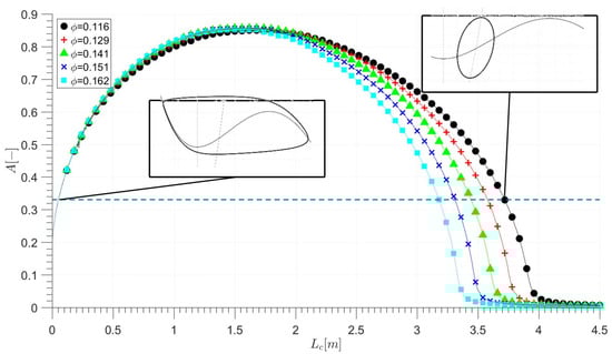 In Figure 7, the amplitude of pressure signal oscillations from simulations in the function of the Lc parameter are presented. It is noted that in all operational points oscillation amplitude grew until it achieved a maximum value and then decreased. Lc values, at which simulation amplitude achieved values near 0, were different for all operational points, which was caused by the different critical value of stability parameter B. As expected, the unstable region was wider for smaller average mass flows. The maximum value of amplitude remained almost the same for all operational points while the value of Lc during this time was decreasing with the rise of the mass flow.