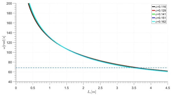 Figure 9 presents the frequency of pressure signal oscillations obtained in simulations in the function of Lc. It is noted that in all operational points, oscillations frequency decreased with the increase of the Lc parameter value. For low values of Lc, the frequency had very high values reaching 700 rad/s and the slope of the curve was very steep (the Y axis was limited to 200 rad/s to facilitate reading of the chart). Valve position had a minor impact on pressure oscillations frequency. On the left-hand side of the figure, it is clear that for higher mass flows oscillations were slightly more frequent, while after reaching approximately Lc = 1.5 m, the dependency reversed and lower mass flows oscillated slightly more frequently. The dashed horizontal line corresponds to one of the frequencies registered during the experiment. In opposition to the amplitude, there was only one value of the Lc parameter at which the simulation had the same frequency as the real pressure signal.
