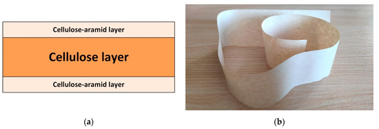 As earlier described in the article’s abstract, for experimental tests the authors used solid insulation made of NOMEX®910 cellulose–aramid electro-technical paper, manufactured by DuPont™. The basis of this material is a high quality thermally improved cellulose pulp. A sheet of electro-technical paper formed from it is then coated on both sides with a thin layer of a binder from a high temperature meta-aramid polymer (NOMEX®). This procedure leads to an increase in the temperature class of the new material, which, for operation in mineral oil, increases to 130 °C (for operation in the environment of esters, it is 140 °C) [12]. In the case of electro-technical paper made of cellulose only, for Kraft type papers, the temperature class is 110–120 °C for operation in mineral oil. Figure 1 presents the cross-section of NOMEX®910 material structure and a real photograph of a small sample.