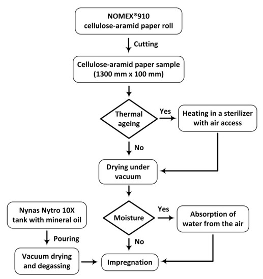 Directly after the accelerated thermal ageing processes and drying in vacuum, the samples were subjected to a process of weight-controlled dampening, which consisted of the paper absorbing moisture directly from the surrounding air for a definite time. The degree of sample moisture was determined as the percentage growth in paper weight to a predefined amount. This has resulted in 4 degrees of sample moisture for all 5 degrees of ageing: 1—initial residual moisture (sample impregnation directly after the vacuum drying process, the adopted degree of sample moisture was close to 0%); 2—1.5% sample moisture; 3—2% sample moisture; and 4—2.5% sample moisture. Directly after the weight-controlled dampening process, the samples were subjected to the process of impregnation with the dielectric fluid. Nynas inhibited mineral insulating oil with commercial symbol Nytro 10× was used for this purpose. Before the impregnation process, insulating oil was initially degassed and dried in a vacuum at a temperature of 60 °C for 2 h, reducing the content of water dissolved in oil to approx. 10 ppm. Figure 2 shows the entire sample preparation process as a diagram.