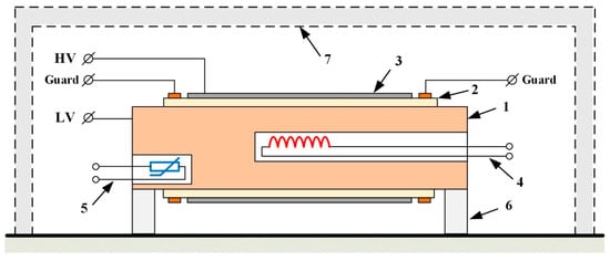 View of the measuring electrode system and the insulation sample studied: 1—a roll made of brass (LV—low potential electrode), 2—aramid–oil insulation sample, 3—metal foil (HV—high potential electrode), 4—heater, 5—temperature sensor, 6—insulator, 7—hermetic vessel plus thermal insulation.