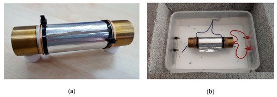 After the impregnation process, the samples were wound on the low potential electrode, which was a brass roll of 160 mm length and 40 mm diameter. In this way, 10 layers of insulation were obtained. The high potential electrode was made of a thin 80 mm aluminum foil. The foil was wound on the roll with the sample. Figure 3 shows a cross section of the electrode system and Figure 4 shows the system ready for testing. The tests were carried out in a hermetic chamber equipped with a system for temperature adjustment and stabilization. The tests were performed in the temperature range from 20 °C to 60 °C, which is consistent with the values typical of PDC diagnostics [13,14,15].