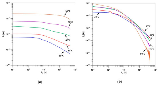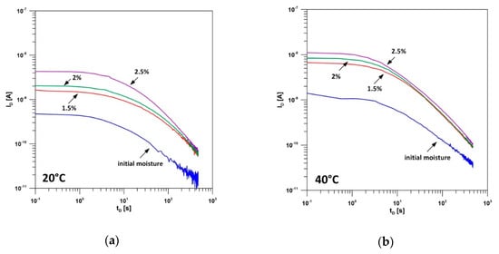 The measurement temperature growth (Figure 9b) also reduced the differences between the depolarization currents of samples with various moisture degrees within approx. 10 s, and this is due to the water migration process from cellulose to oil intensifying with increased temperature. The phenomenon described was observed for all the examined insulation samples, regardless of the degree of ageing (thermal degradation of cellulose fibers). The characteristics presented on Figure 8 and Figure 9 are only general in nature.