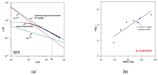 Using the sample depolarization current characteristics depending on the measurement temperature, it was decided to analyze, using Equations (1)–(4), the dependence of the activation energy EA on the degree of moisture of the cellulose–aramid insulation. Figure 10 presents the manner of fixing characteristic time tA (Figure 10a) and the activation energy EA value (Figure 10b) with the use of the Arrhenius graph [24] for a selected non-aged sample with the smallest degree of moisture.