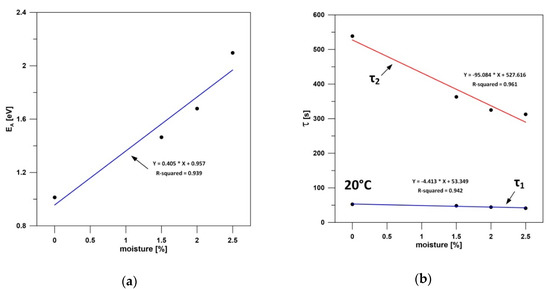 Dependence of the activation energy EA (a) and dominant time constants τ1 and τ2 (b) on the degree of moisture for a selected non-aged cellulose–aramid insulation sample.