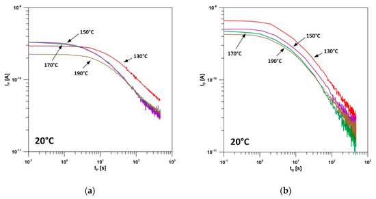 Figure 12 presents exemplary characteristics of the polarization currents (Figure 12a) and the depolarization currents (Figure 12b) measured for unmoistened samples with various ageing degrees. It was decided to analyze the effect of the degree of ageing in the temperature range of initial degradation of cellulose fibers (before the impregnation process) from 130 °C to 190 °C, with steps every 20 °C.