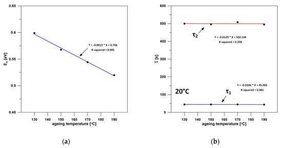 Figure 13 presents the effect of the degree of sample ageing on the activation energy EA value (Figure 13a) and values of two dominant time constants of the relaxation processes (Figure 13b), which were determined on the basis of the depolarization current characteristics according to Equation (5).