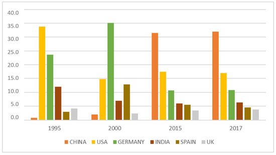 Top six countries by cumulative wind energy capacity (%) (MW) (1995–2017) elaborated from [66].