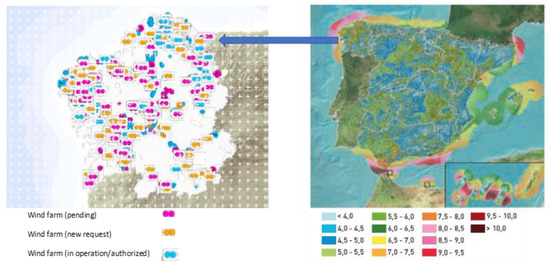 Map of the Wind Registry of Galicia (left) and Wind Atlas of Spain at a wind speed of 60 (60, 80 and 100 m, are considered a range of representative hub heights of medium and heavy-duty commercial wind turbines existing on the market) meters/second (right) elaborated from [70,73] p. 21.