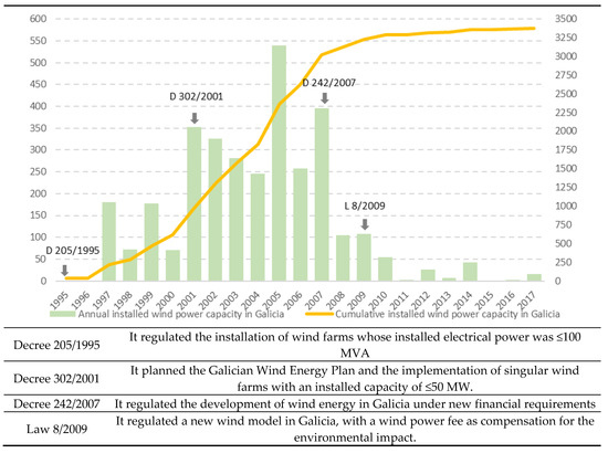 Installed wind power and principal legislation. Galicia (1995–2017) elaborated from [63,68].