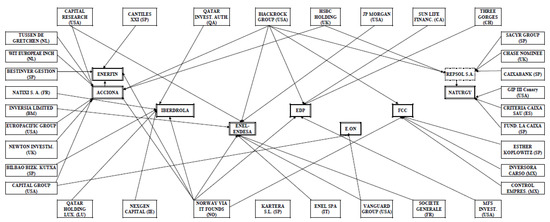 Finance from the banking sector has been one of the driving forces behind advances in the Spanish energy sector [42]. The influence and power of the big energy companies enables them to centralize capital while controlling a large part of industrial investment and links with other sectors (construction companies and banks) (ibid) [43,44]. The leading role that the banks have taken in industrial and commercial expansion has been examined in several studies, for instance, in an analysis of the business network in America [45]. This analysis found that the presiding power was obtained by the participation of financial institutions in other corporations. This was because, firstly, it was perfectly in line with the companies established procedures [46] or secondly, it was obtained to enable a credit cash flow [47]. This same behavior was also studied in relation to the United Kingdom, the United States and Japan during the 1970s [48]. What was found was that the most important companies were not controlled by just one shareholder, but rather by a system of interpersonal and inter-corporation participation. One other point that stood out in this system was the link between elite businesses and the political class, a connection which influences the structure of the legal framework applied, and can also determine investment and distribution of capital in an economy [49,50,51].