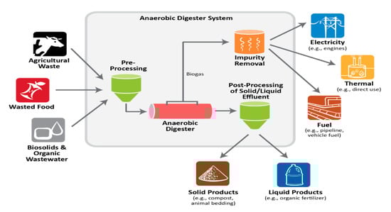- United States Environmental Protection Agency EPA/600/R-15/304 Anaerobic Digestion and Its Applications. Available online: https://www.epa.gov/sites/production/files/2016-07/documents/ad_and_applications-final_0.pdf (accessed on 13 July 2020).