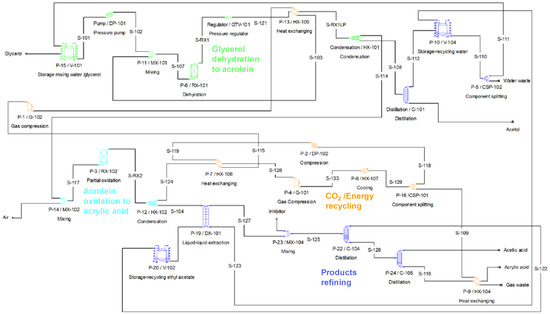 The plant is designed to continuously operate three shifts per day, 350 days per year, converting 3810 metric tons of glycerol (80 wt.%) from an intermediate-sized biodiesel facility to acrylic acid (1700 metric tons) with acetol (314 metric tons) and acetic acid (350 metric tons) as coproducts. It is noteworthy that this is rather small scale comparing to 80–160 metric tons annually for a commercial acrylic acid plant using propylene as feedstock. The SuperPro Designer flowchart is presented in Figure 1, with four color-coded process sections modeling glycerol dehydration to acrolein, acrolein oxidation to acrylic acid, product refining, and CO2/energy recycling.