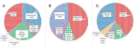 Breakdown of annual operating cost for the Base Model, (A) by categories, (B) by process sections, and (C) further breakdown of the utility category.