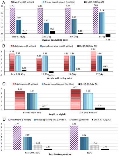 Historically, the acrylic acid price greatly fluctuated, heavily dependent on the petroleum market and the supply of propylene. Nonetheless, the global acrylic acid market is expected to reach USD $22.6 billion by 2022, with demand in superabsorbent polymer production as a key driving factor for market growth, according to a study by Grand View Research, Inc., San Francisco, CA, USA [20]. It appears that acrylic acid priced at $2/kg is the break-even point for the Base Model (Figure 3B).